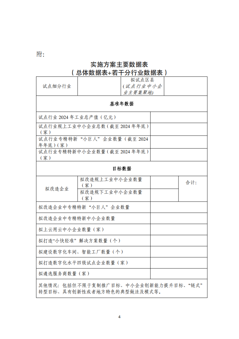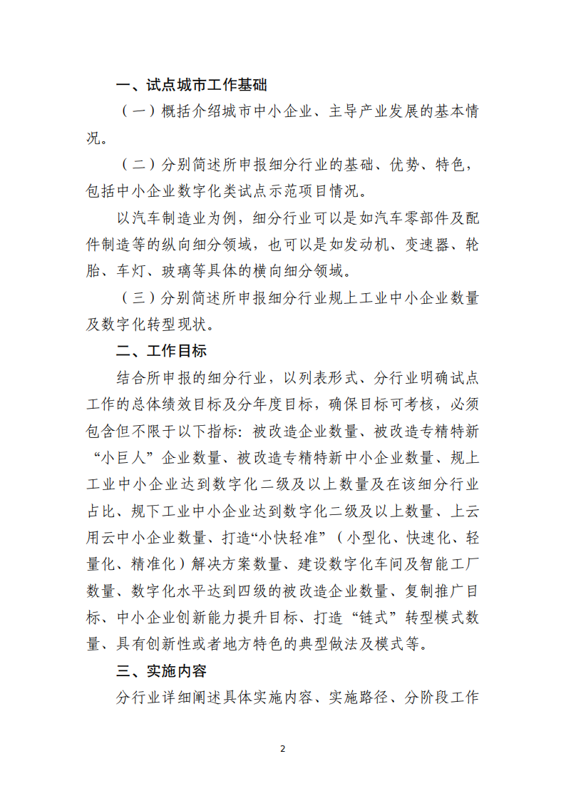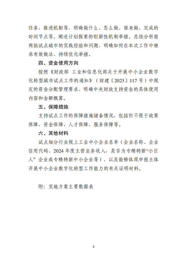 为深入贯彻落实党中央、国务院决策部署,加大对中小企业数字化转型的支持,根据《财政部 工业和信息化部关于开展中小企业数字化转型城市试点工作的通知》(财建〔2023〕117号,以下简称《通知》)要求,现就2025年中小企业数字化转型城市试点申报工作有关事项通知如下: