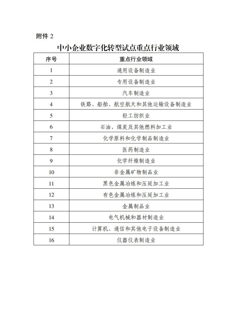 (一)聚焦重点行业。试点城市应坚持推动传统产业改造升级和促进战略新兴产业、未来产业发展并重,在计算机和通信电子设备制造、通用和专用设备制造、汽车制造等制造业重点行业(参考附件2)中选择具体细分领域开展数字化转型试点,选取的细分行业应符合国家区域战略发展规划和产业导向,体现自身产业基础和特色优势,具有产值规模较大、中小企业集聚度较高、改造潜力较深、改造后效益提升明显的特征,避免分散。要结合不同行业特点,深入梳理行业共性改造需求,分业分级推进试点企业的数字化改造。