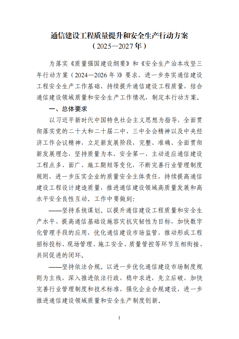 《通信建设工程质量提升和安全生产行动方案(2025-2027年)》的通知