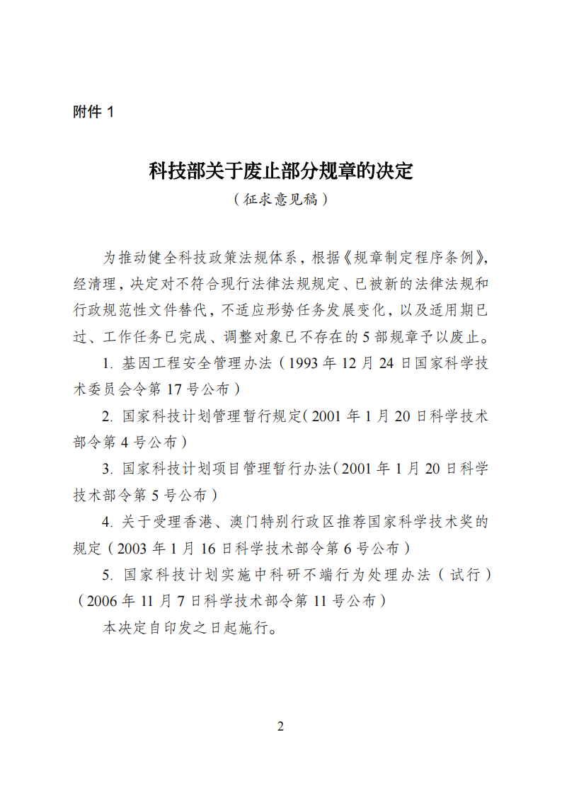 附件:1. 科技部关于废止部分规章的决定(征求意见稿)