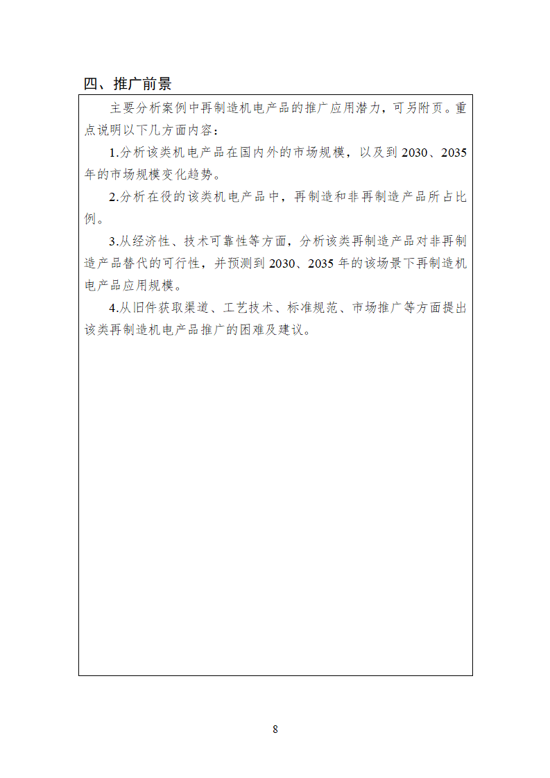(一)请各省级工业和信息化主管部门组织本地区机电产品再制造企业填报申报材料,就申报材料中案例的先进性、可复制性等进行评估,择优推荐符合要求的典型案例,每个省(区、市)推荐的案例原则上不超过5个。