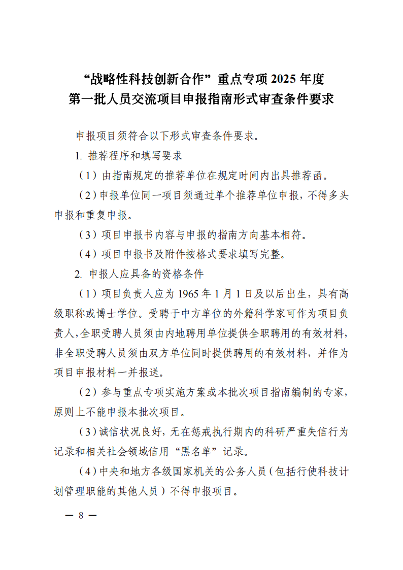 科技部国际合作司关于发布国家重点研发计划“战略性科技创新合作”重点专项2025年度第一批人员交流项目申报指南的通知