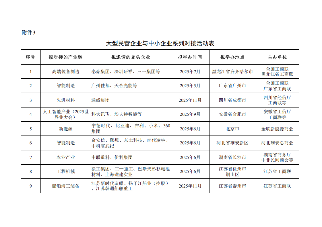 为深入贯彻落实党中央、国务院关于推动产业链上中下游、大中小企业融通创新的决策部署,按照《工业和信息化部等十一部门关于开展“携手行动” 促进大中小企业融通创新(2022—2025年)的通知》(工信部联企业〔2022〕54号)要求,推动创新链产业链资金链人才链深度融合,工业和信息化部、国务院国资委、国家知识产权局、全国工商联联合组织开展2025年“百场万企”大中小企业融通对接活动,有关事项通知如下: