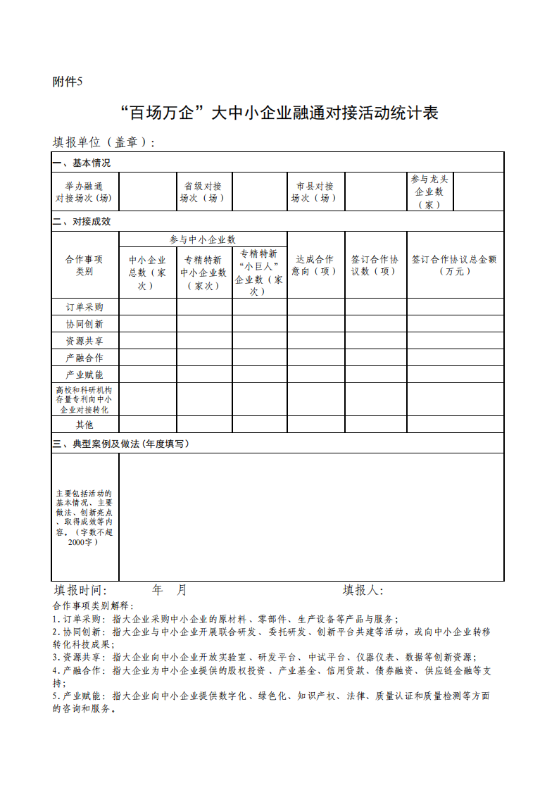 (四)做好信息报送。各地中小企业主管部门牵头,会同同级国资委、知识产权局、工商联做好活动信息报送工作,于每季度末登录“全国大中小企业融通创新服务平台”,在“百场万企—成效专区”填报“百场万企”大中小企业融通对接活动成效,并于12月20日前将“百场万企”大中小企业融通对接活动统计表(附件5)电子版及盖章版报送至工业和信息化部(邮箱:cxfwc@miit.gov.cn),在重要活动举办后及时报送活动信息和成效。