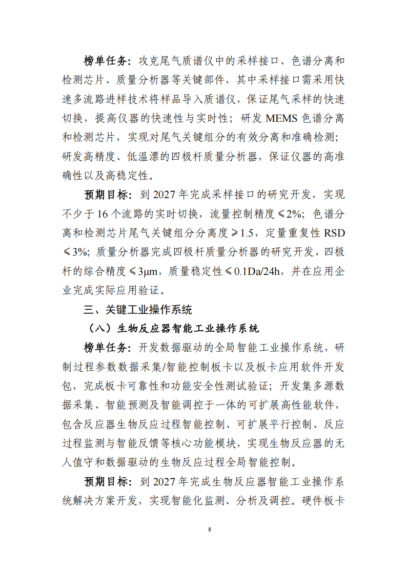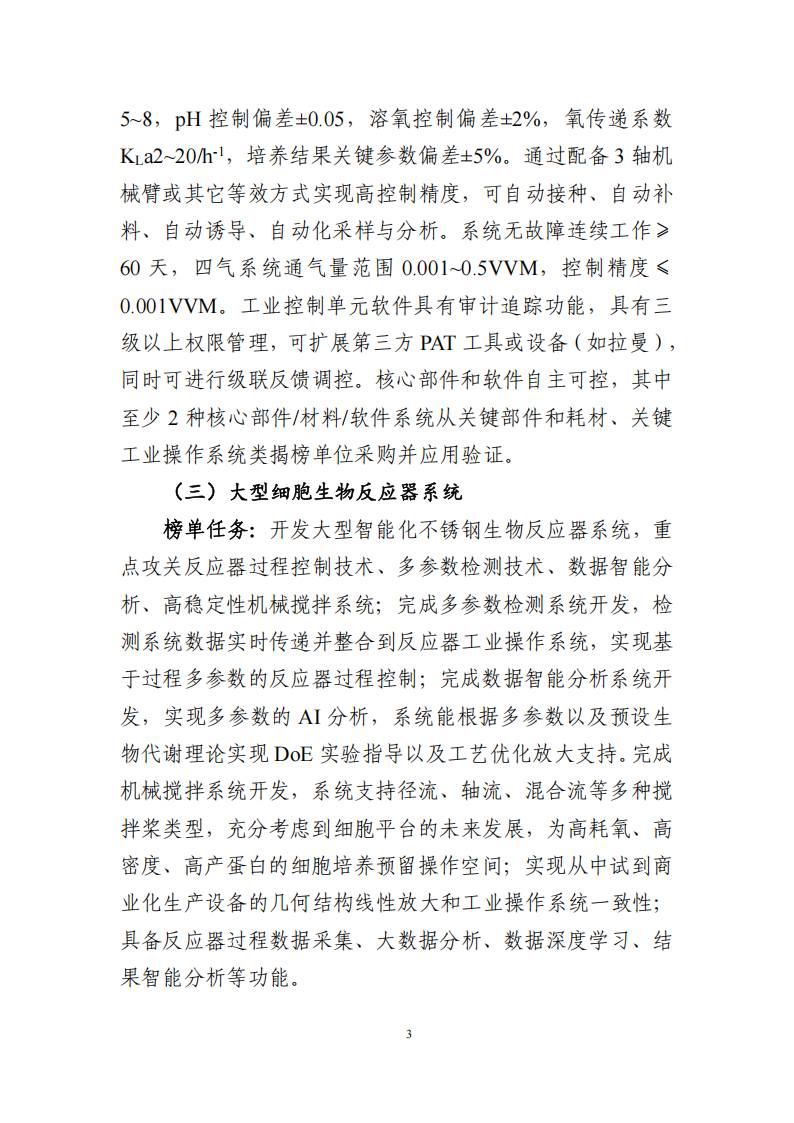 聚焦反应器系统、关键部件与耗材、工业操作系统3类9项揭榜任务,遴选培育一批掌握关键核心技术、具备较强创新能力的优势单位,突破一批标志性技术装备,培育典型应用场景,加速新技术新产品落地应用,提升高性能生物反应器“技术研发—供需匹配—生产制造—规模应用”一体化发展能力。