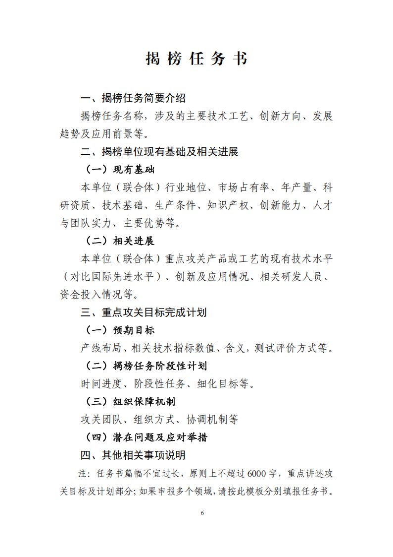 (四)任务实施。各省级工业和信息化主管部门配合工业和信息化部、中国科学院组织入围揭榜单位或联合体签订任务书,明确相关任务目标要求及时间节点。入围揭榜单位或联合体按榜单要求和任务书承诺时限完成揭榜任务后,工业和信息化部、中国科学院委托第三方专业机构和专家开展评价工作,择优确定揭榜任务成功单位或联合体,每个揭榜方向原则上不超过5家。