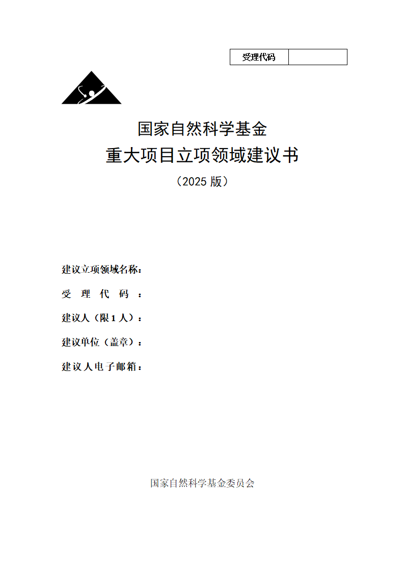2.请填写“重大项目立项领域建议书”(Word模板见附件2),建议人限1人,根据建议书内容选择受理代码,T01:物质科学,T02:智能科学与智造,T03:生命科学与健康,T04:融合科学。并于2025年7月31日16:00前,将Word电子版文件及加盖建议单位公章(建议人依托单位)后扫描生成的PDF版文件发至交叉科学部综合与战略规划处电子邮箱:interdis@nsfc.gov.cn。