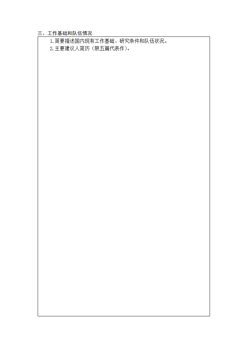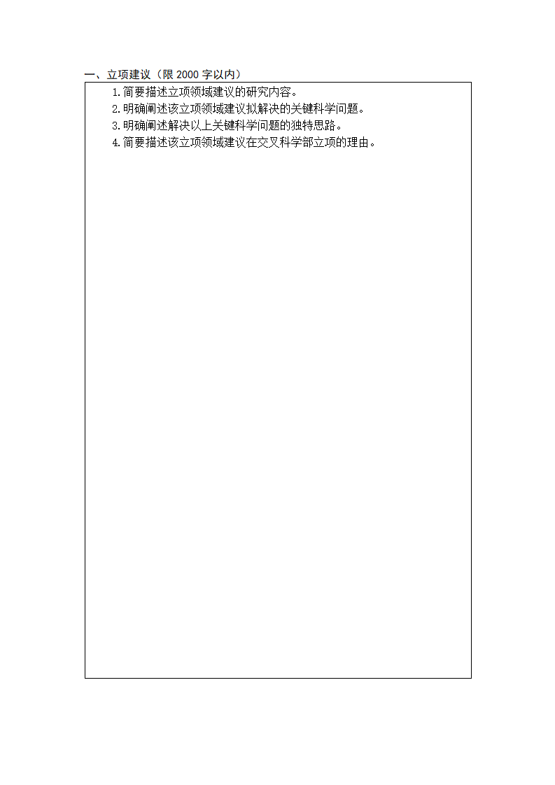 1.请填写“重大研究计划立项设想建议书”(Word模板见附件1),计划经费为2亿元,计划执行期限为2027年至2034年,主管科学部为交叉科学部,根据建议书内容填写相关科学部。并于2025年7月31日16:00前,将Word电子版文件发至交叉科学部综合与战略规划处电子邮箱:interdis@nsfc.gov.cn。