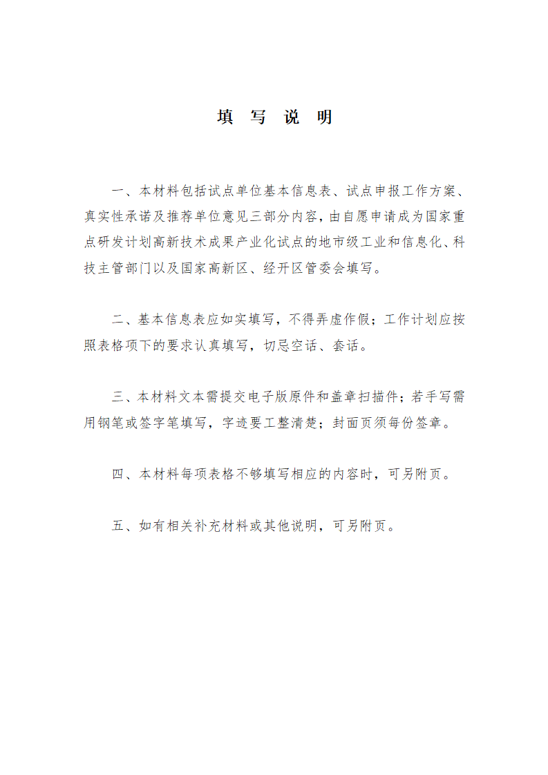 (一)明确工作重点。试点主体应认真研究制定试点工作方案,围绕工业和信息化部后续发布的国家重点研发计划推介成果,明确试点实施计划及预期成效,提出配套支持措施。试点实施周期为名单发布之日起2年,期间,试点区域/单位应至少围绕3个/1个工业和信息化部发布的高新技术推介成果推动开展产业化工作,至少参加1次工业和信息化部组织的高新技术成果产业化对接交流活动,每年底报送工作进展报告。