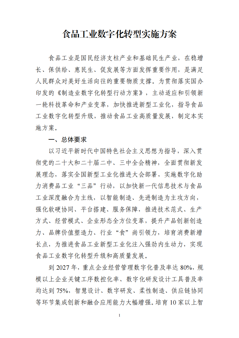 工业和信息化部等七部门关于印发《食品工业数字化转型实施方案》的通知