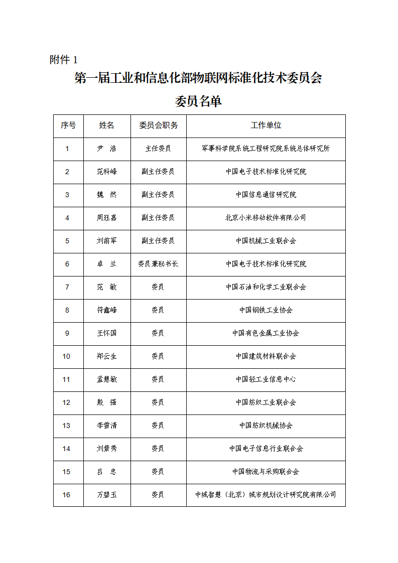 附件:1.第一届工业和信息化部物联网标准化技术委员会委员名单