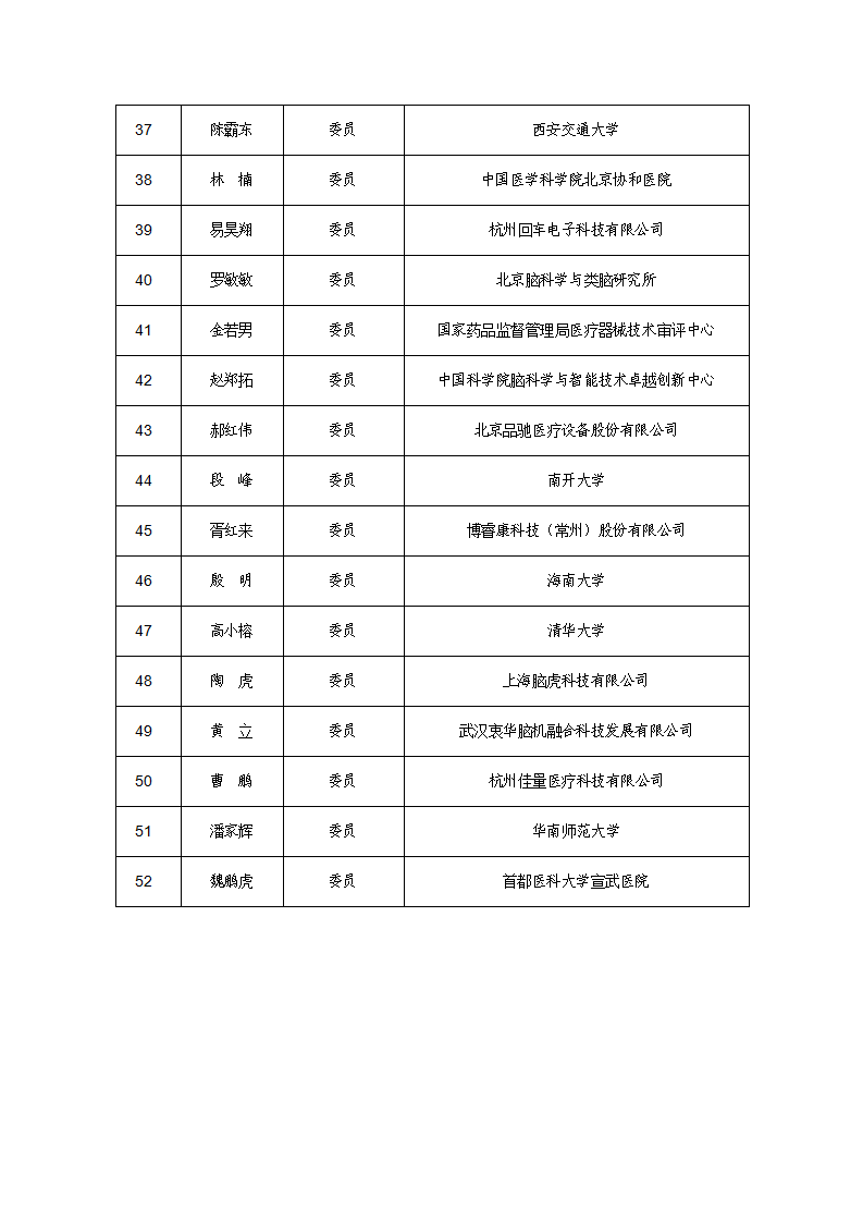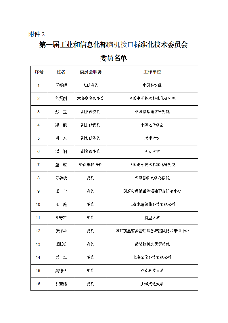 工业和信息化部脑机接口标准化技术委员会,编号为MIIT/TC4,主要负责脑机接口基础共性、输入输出接口、数据、行业应用、伦理安全等领域行业标准制修订工作。第一届工业和信息化部脑机接口标准化技术委员会由52名委员组成(见附件2),秘书处由中国电子技术标准化研究院承担。