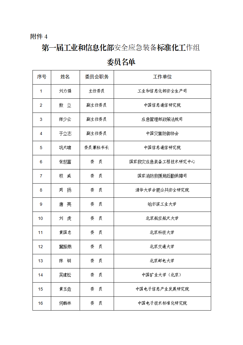 工业和信息化部安全应急装备标准化工作组,编号为MIIT/SWG1,主要负责安全应急装备基础通用、信息技术应用、智能装备和管理服务等领域行业标准制修订工作。第一届工业和信息化部安全应急装备标准化工作组由75名委员组成(见附件4),秘书处由中国信息通信研究院承担。
