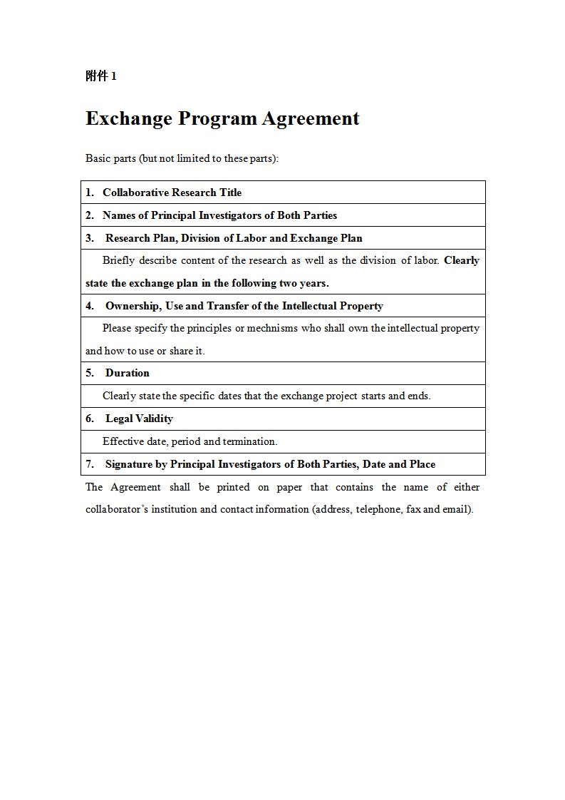 (1)申请合作交流项目,须提交合作协议(协议模板见附件1)。中外双方申请人须就合作内容、交流计划及知识产权归属和分享的原则或机制等问题达成一致,并签署合作交流协议。