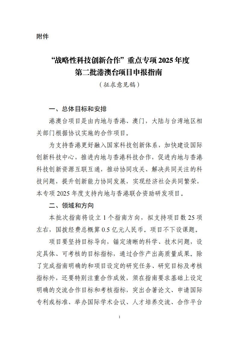 关于对国家重点研发计划“战略性科技创新合作”重点专项2025年度第二批港澳台项目申报指南征求意见的通知