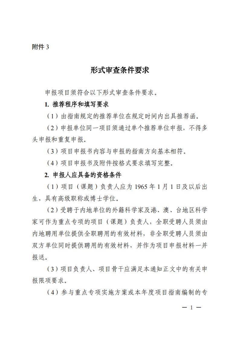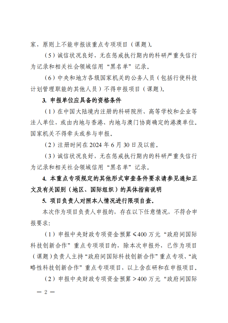 1.本批次指南项目属于“政府间国际科技创新合作”重点专项联合研发项目,本次申报的项目牵头申报单位和参与单位应为中国大陆境内注册的科研院所、高等学校和企业等(以下简称内地单位),或由内地与香港、内地与澳门协商确定的港澳单位(附件1)。