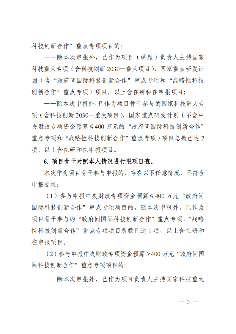 对于中央财政专项资金预算不超过400万元的“政府间国际科技创新合作”重点专项(简称政府间专项)和“战略性科技创新合作”重点专项(简称战略性专项)项目,与国家重点研发计划其他专项项目互不开展限项审查,对国家科技重大专项(含科技创新2030—重大项目)项目不开展限项审查;项目(课题)负责人的申报和在研的政府间专项和战略性专项项目的总数限为1项(含不超过400万元的项目);同时,项目骨干的申报和在研的政府间专项和战略性专项项目的总数限为1项(含不超过400万元的项目)。政府间专项和战略性专项的人员交流项目不计入上述限项总数范围。