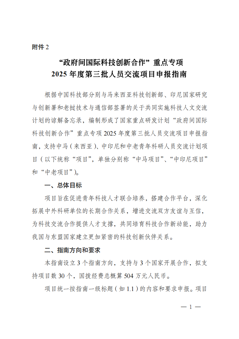 根据《国家重点研发计划管理暂行办法》(国科发资〔2024〕28号)相关要求,现发布“政府间国际科技创新合作”重点专项2025年度第三批人员交流项目申报指南。请根据指南要求组织项目申报工作。有关事项通知如下。