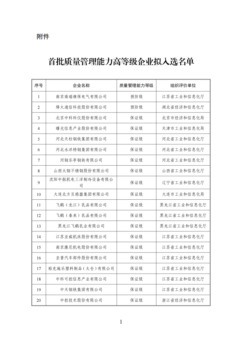 2024年,我们深入贯彻《制造业卓越质量工程实施意见》,以《制造业企业质量管理能力评估规范》行业标准为依据,组织开展制造业企业质量管理能力评价工作。为加强社会监督,现将首批43家评价复核结果达到保证级及以上高等级企业名单(见附件)予以公示。如有异议,请在公示期内将意见反馈至工业和信息化部科技司。