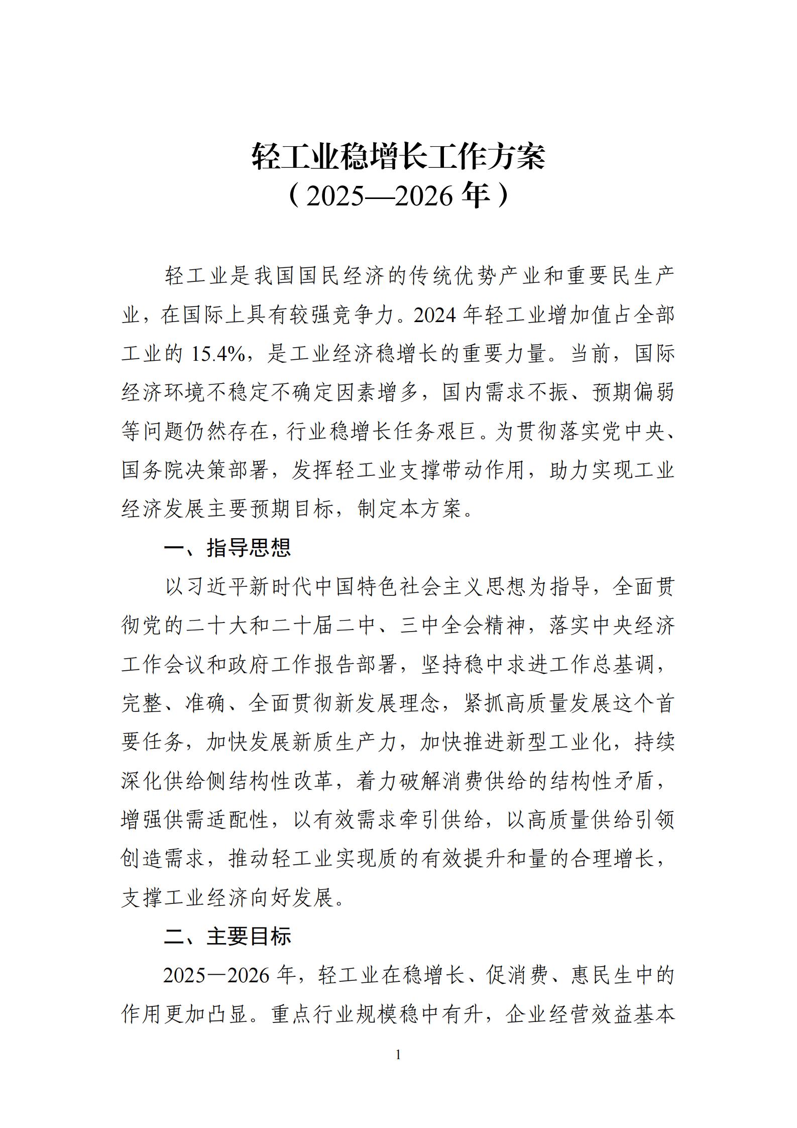 三部门关于印发《轻工业稳增长工作方案(2025—2026年)》的通知