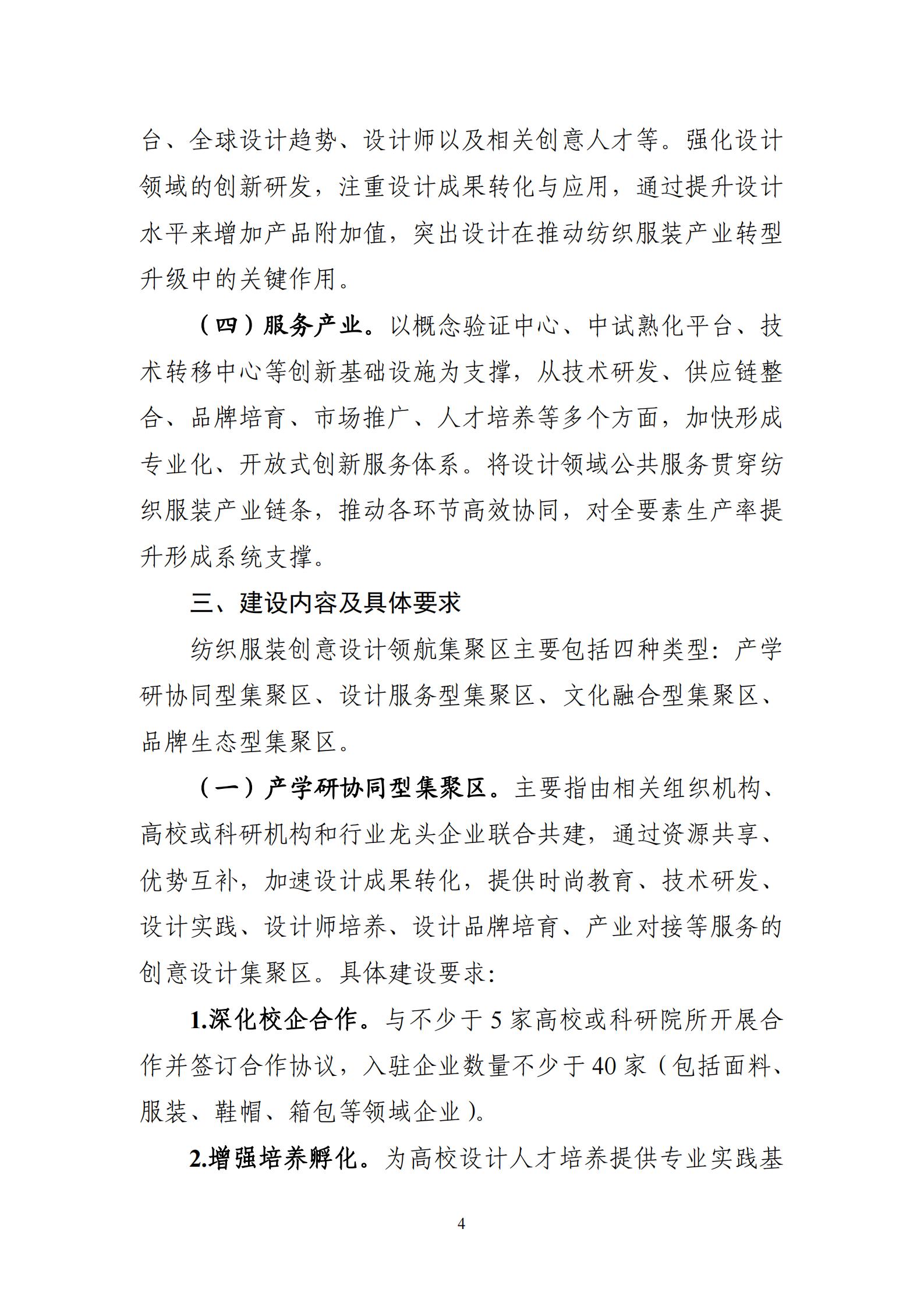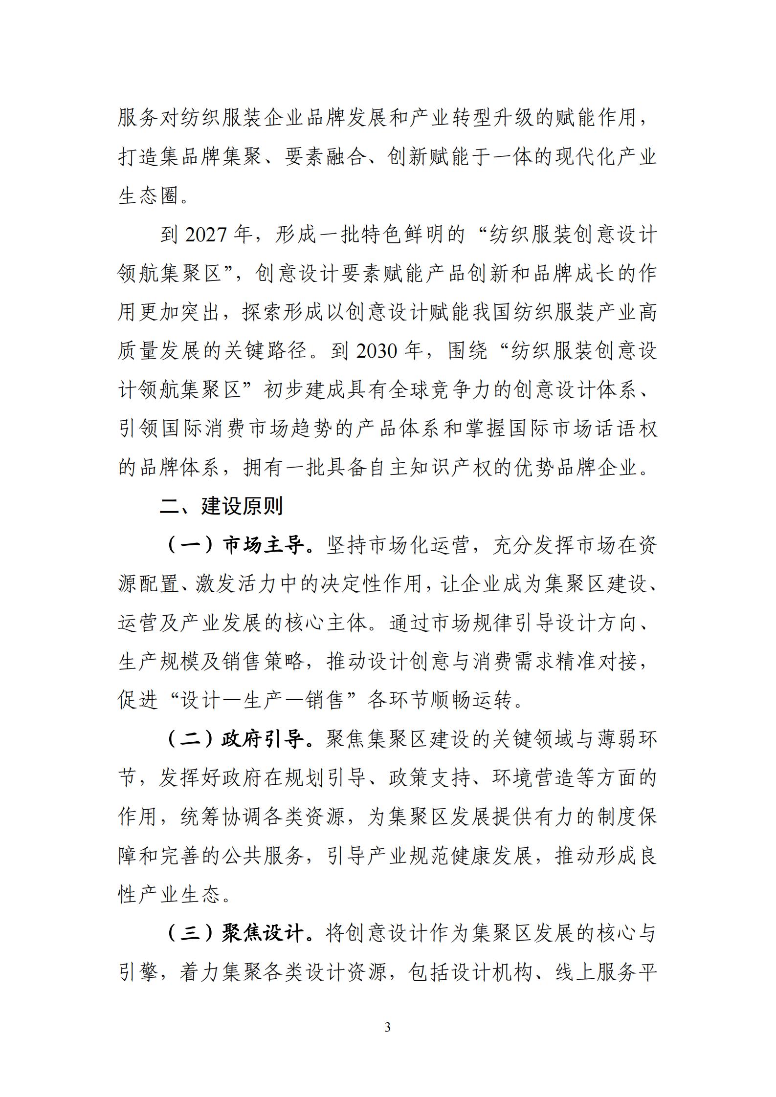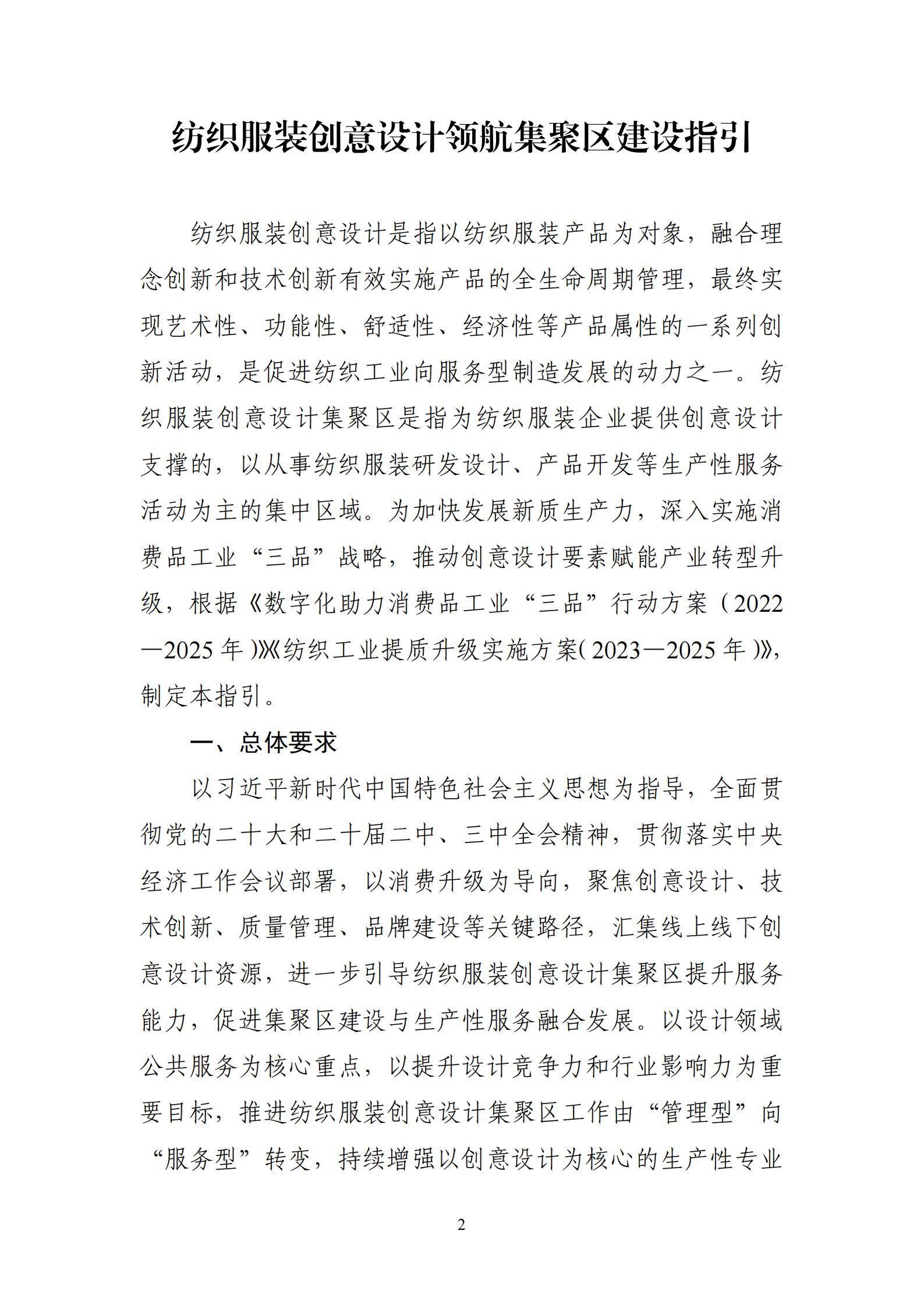 为加快培育纺织行业新质生产力,深入实施消费品工业“三品”战略,推动创意设计要素赋能纺织工业转型升级,根据《纺织工业提质升级实施方案(2023—2025年)》,我部组织编制了《纺织服装创意设计领航集聚区建设指引》。现印发给你们,请结合实际,认真抓好落实。