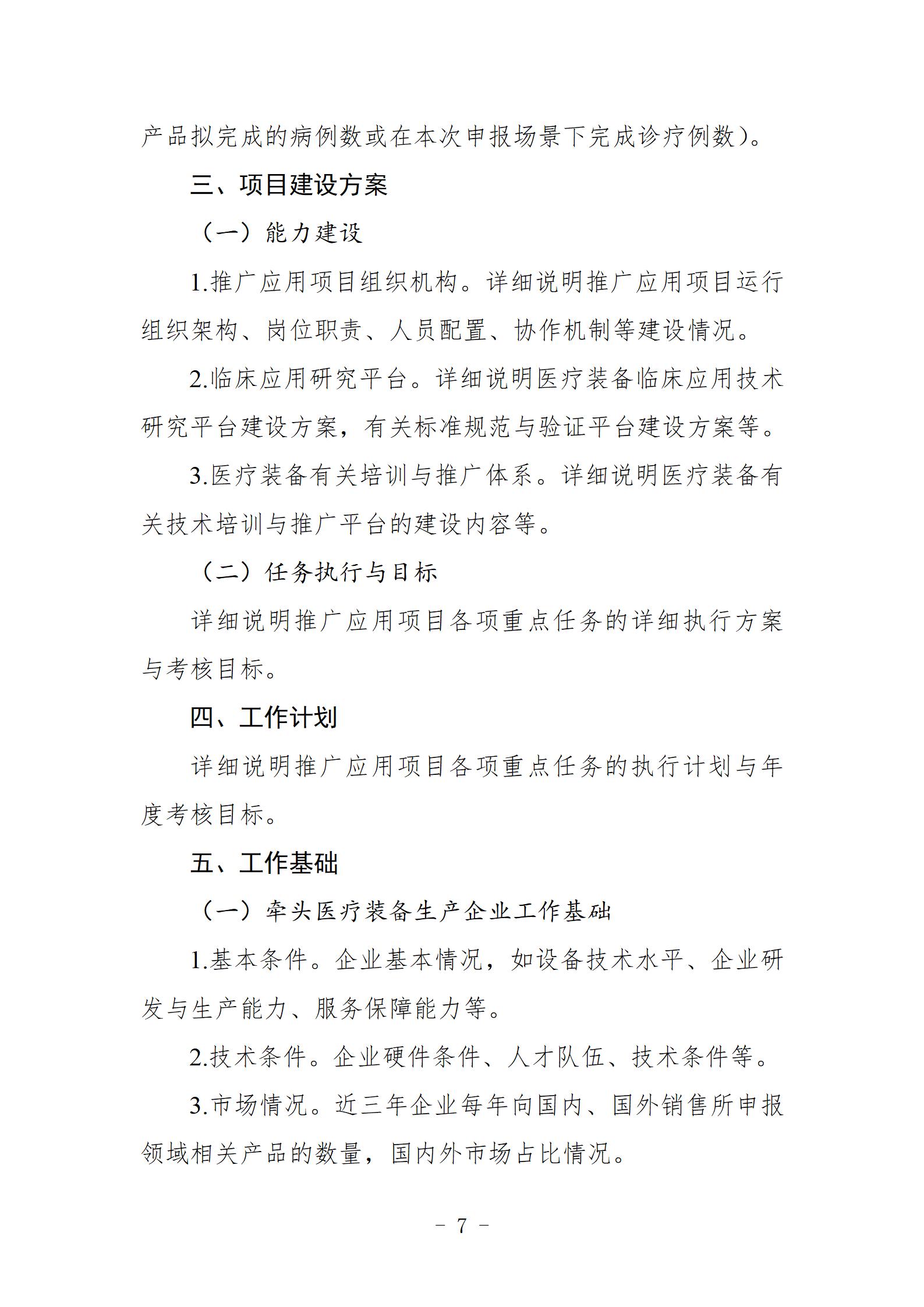面向高端医疗装备重点产品和典型场景,遴选一批技术创新水平与临床应用水平处于全国前列,对医工协同创新、中试验证、临床研究、迭代升级与推广应用等具有较强引领带动作用的项目。本年度重点开展5类重点产品(见附件1)和4类典型场景(见附件2)的推广应用。
