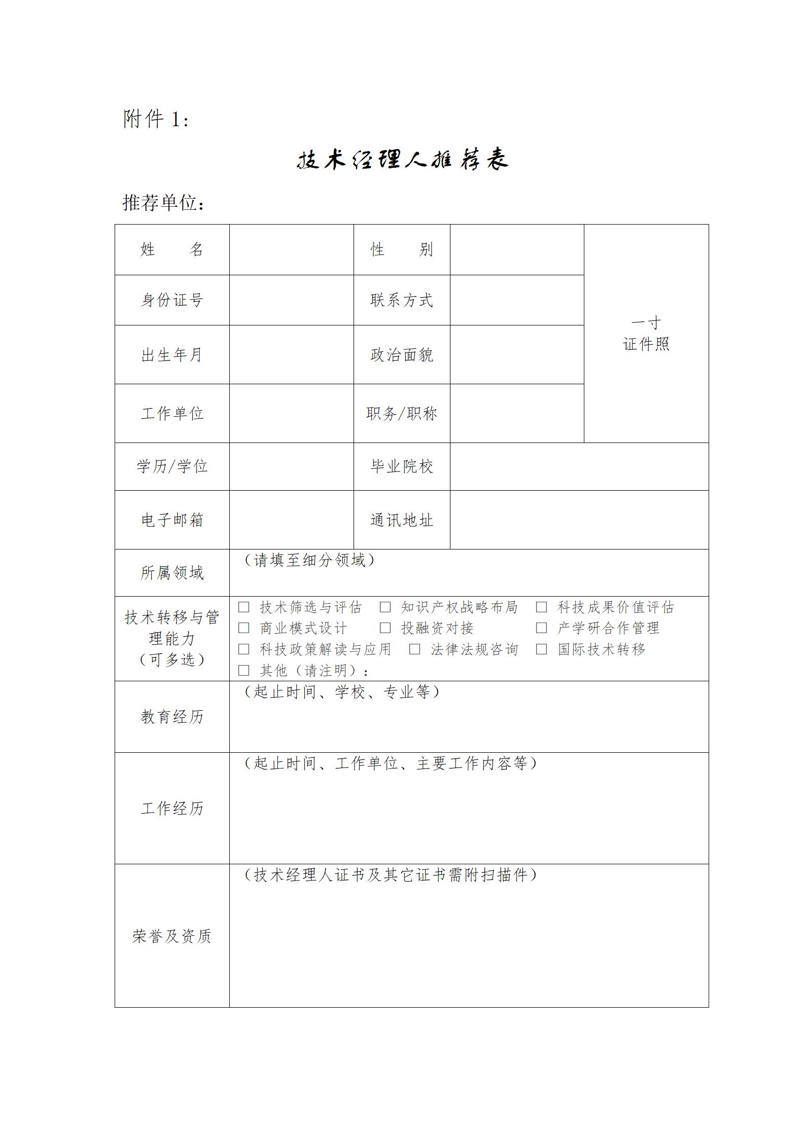 被推荐人需如实填写《技术经理人推荐表》和《技术经理人保密承诺书》(详见附件),由推荐单位填写意见并加盖公章。推荐材料电子版(Word格式)及盖章扫描版(PDF格式)一并发送至指定邮箱:px@chinasme.org.cn,邮件主题请注明“技术经理人专家库推荐材料+推荐单位名称”。