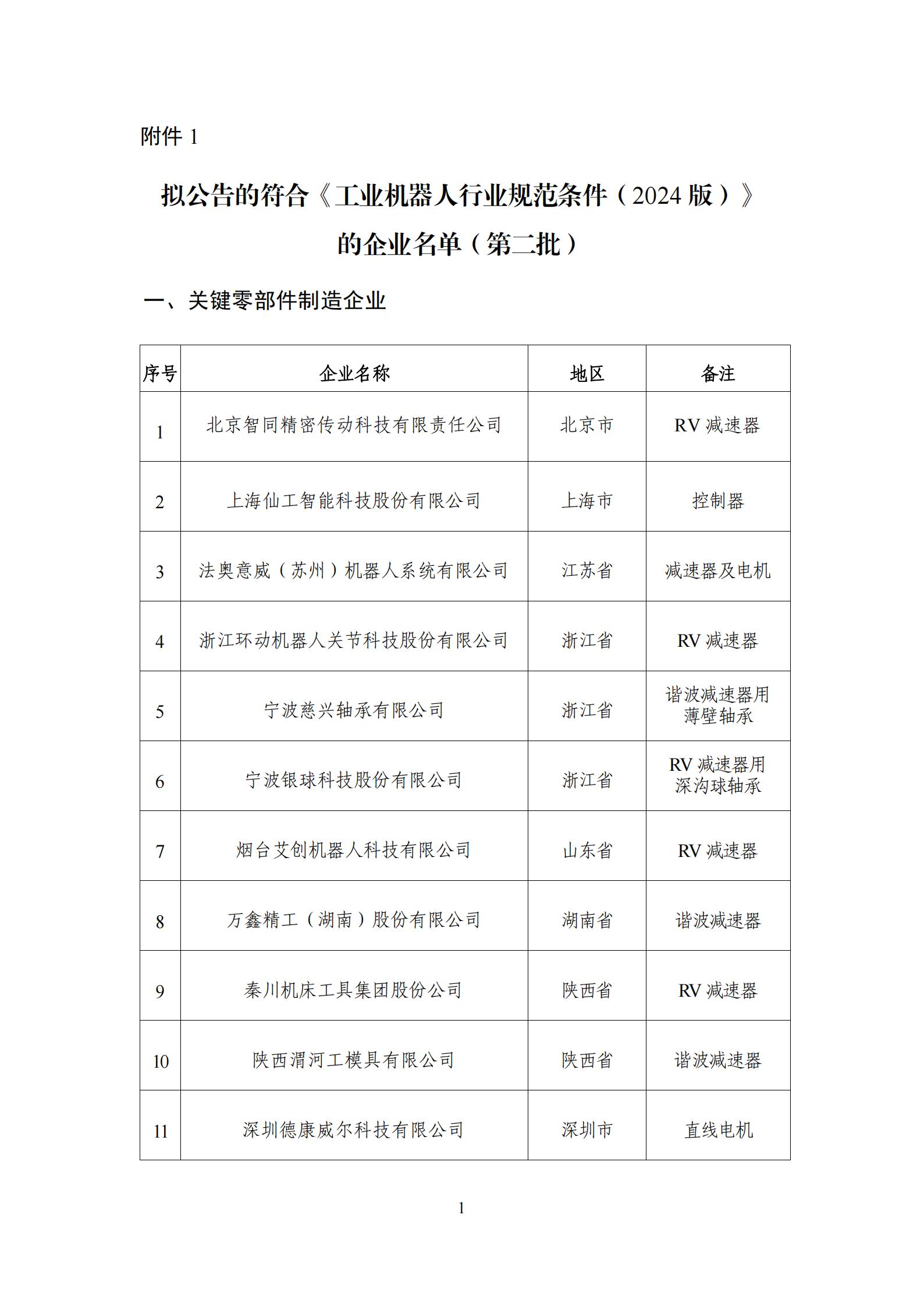 根据《工业机器人行业规范条件(2024版)》《工业机器人行业规范条件管理实施办法(2024版)》(部公告2024年第20号)有关要求,我部组织各地工业和信息化主管部门、有关中央企业开展了第二批工业机器人行业规范企业公告申报工作。经审核,现将符合《工业机器人行业规范条件(2024版)》的企业名单(第二批)予以公示,请社会各界监督。如有异议,请在公示期内将书面意见反馈至装备工业一司。