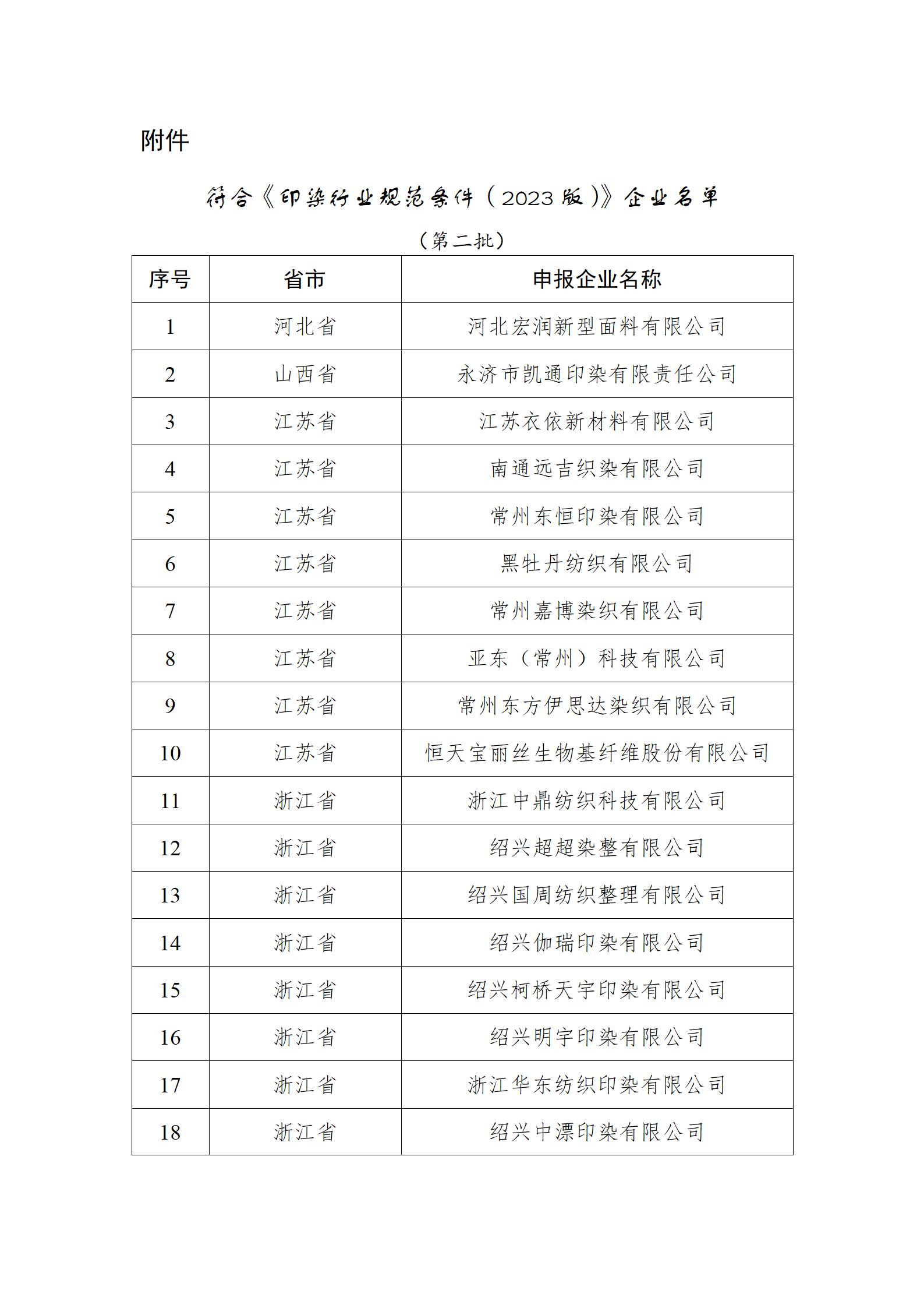 根据《印染企业规范公告管理办法》有关规定,经企业自主申报、省级工业和信息化主管部门核实推荐、专家组评审及征求生态环境部意见、对外公示等程序,现将符合《印染行业规范条件(2023版)》企业名单(第二批)予以公告。