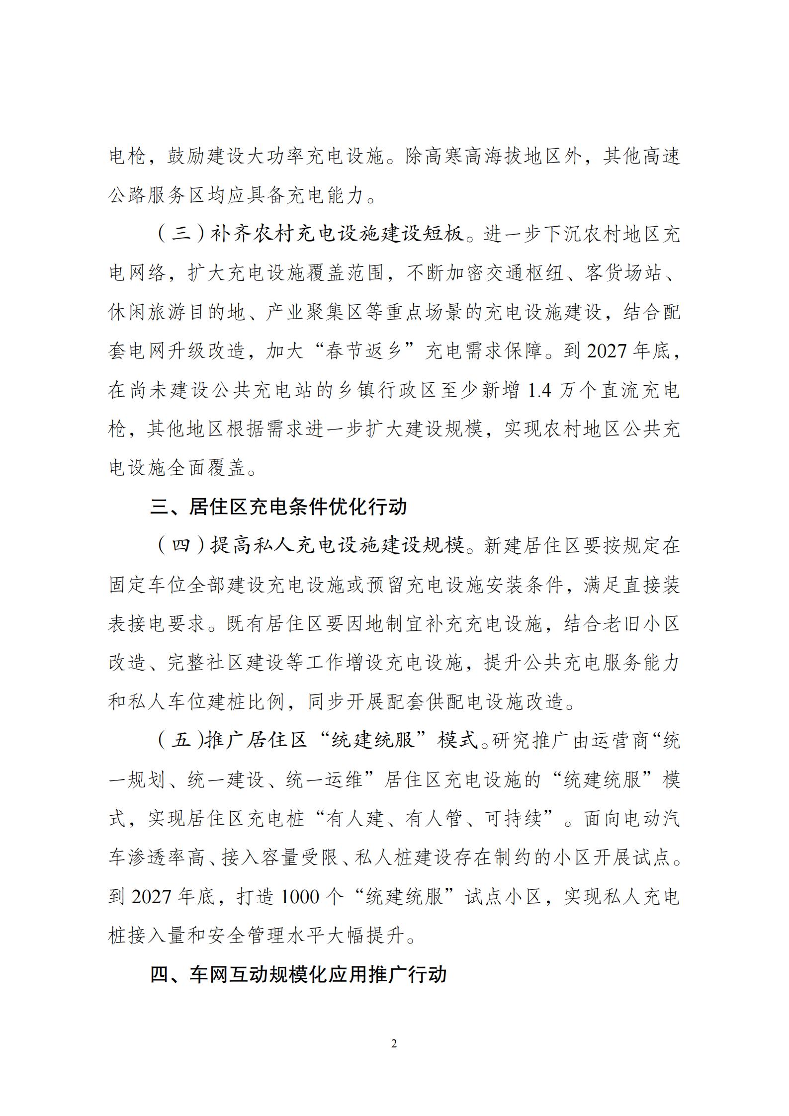 为落实《提振消费专项行动方案》有关要求,加大力度完善电动汽车充电设施服务网络,提升消费品质,促进电动汽车更大范围内购置使用,国家发展改革委等部门研究制定了《电动汽车充电设施服务能力“三年倍增”行动方案(2025—2027年)》,现印发给你们,请认真组织落实。