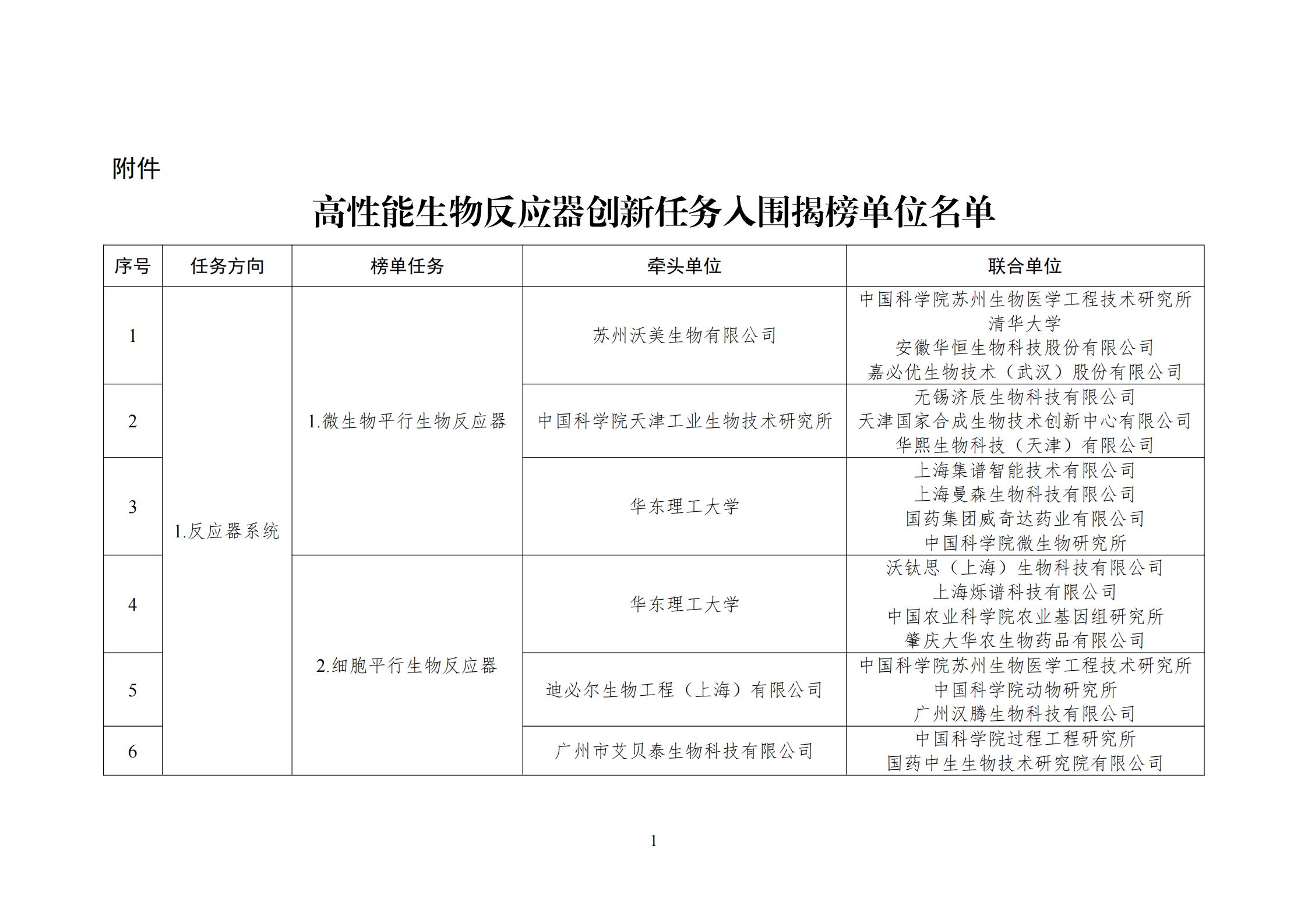附件:高性能生物反应器创新任务入围揭榜单位名单