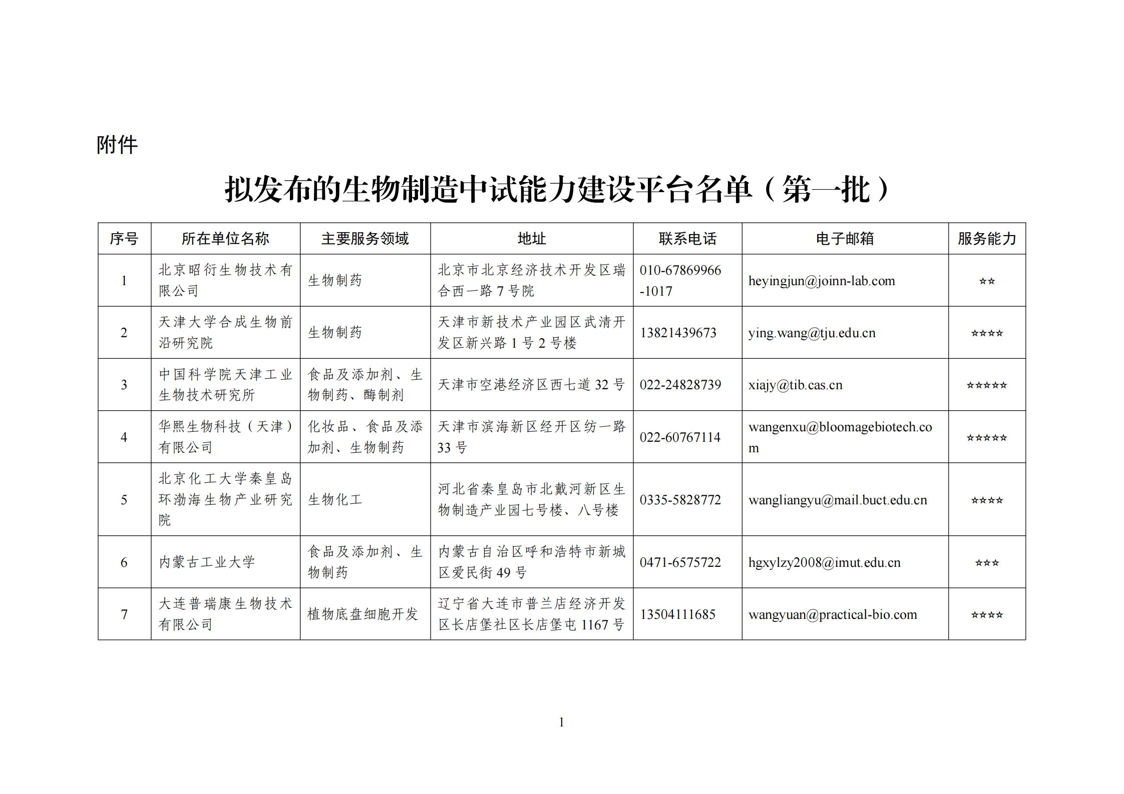 生物制造中试能力建设平台名单(第一批)公示