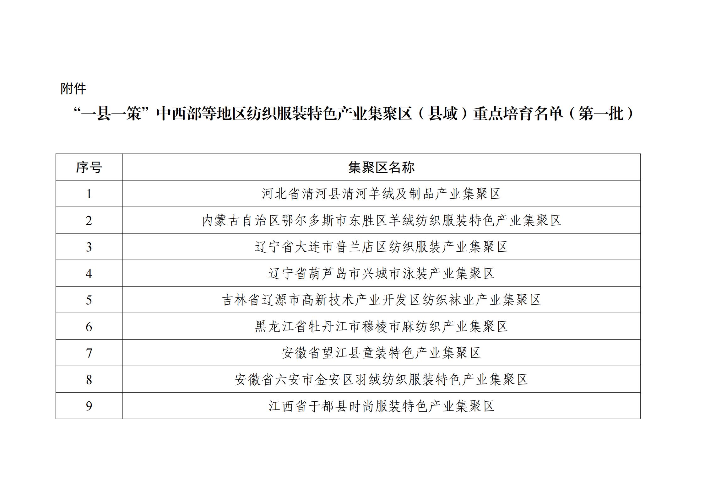 工业和信息化部关于公布《“一县一策”中西部等地区纺织服装特色产业集聚区(县域)重点培育名单(第一批)》的通告