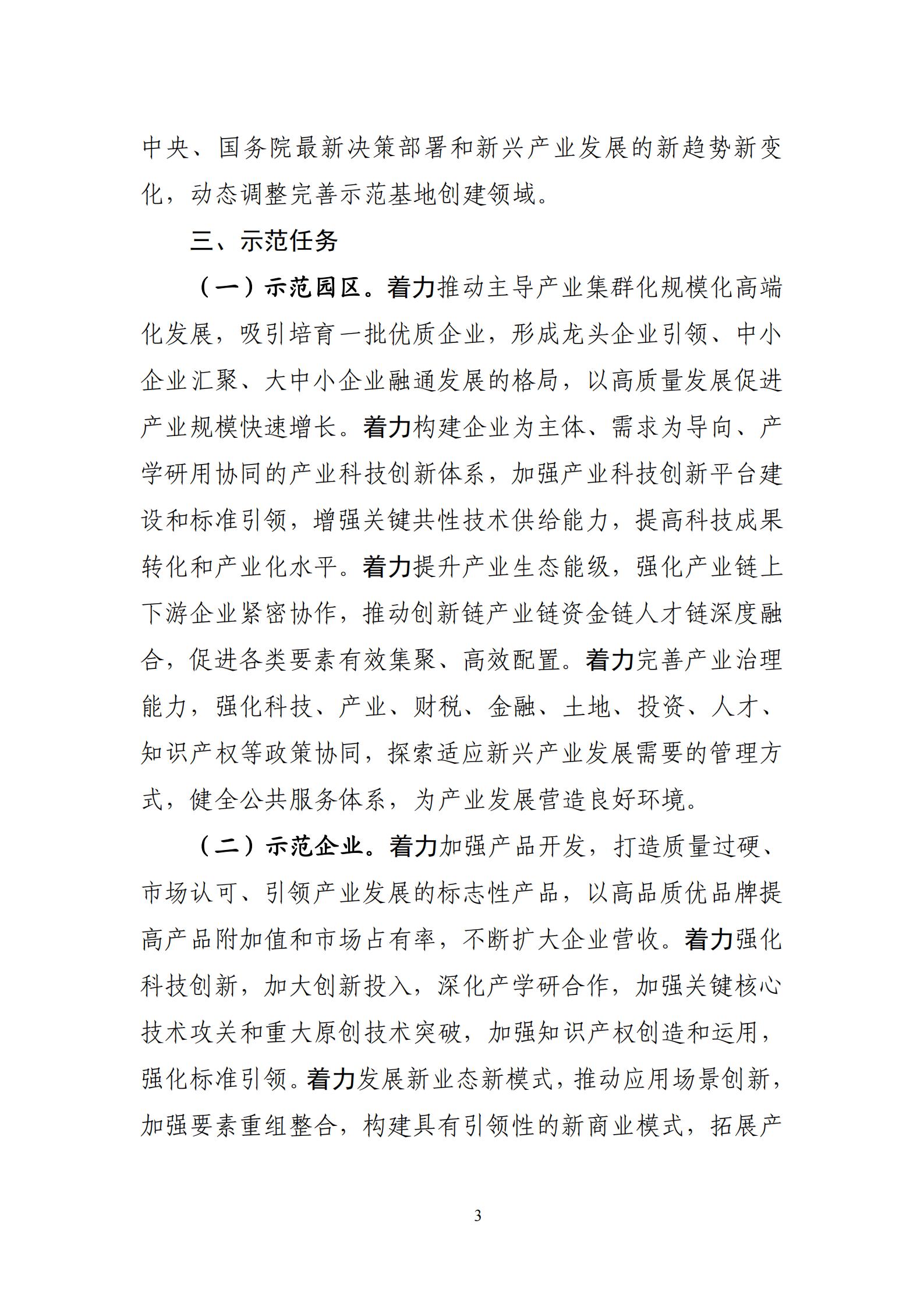 为贯彻落实党中央、国务院关于发展壮大新兴产业的决策部署,选树新兴产业发展示范标杆,引领带动我国新兴产业健康有序发展,工业和信息化部决定开展“国家新兴产业发展示范基地”(以下简称示范基地)创建活动。请按照《国家新兴产业发展示范基地创建活动工作方案》要求,组织做好本地区示范基地创建工作。