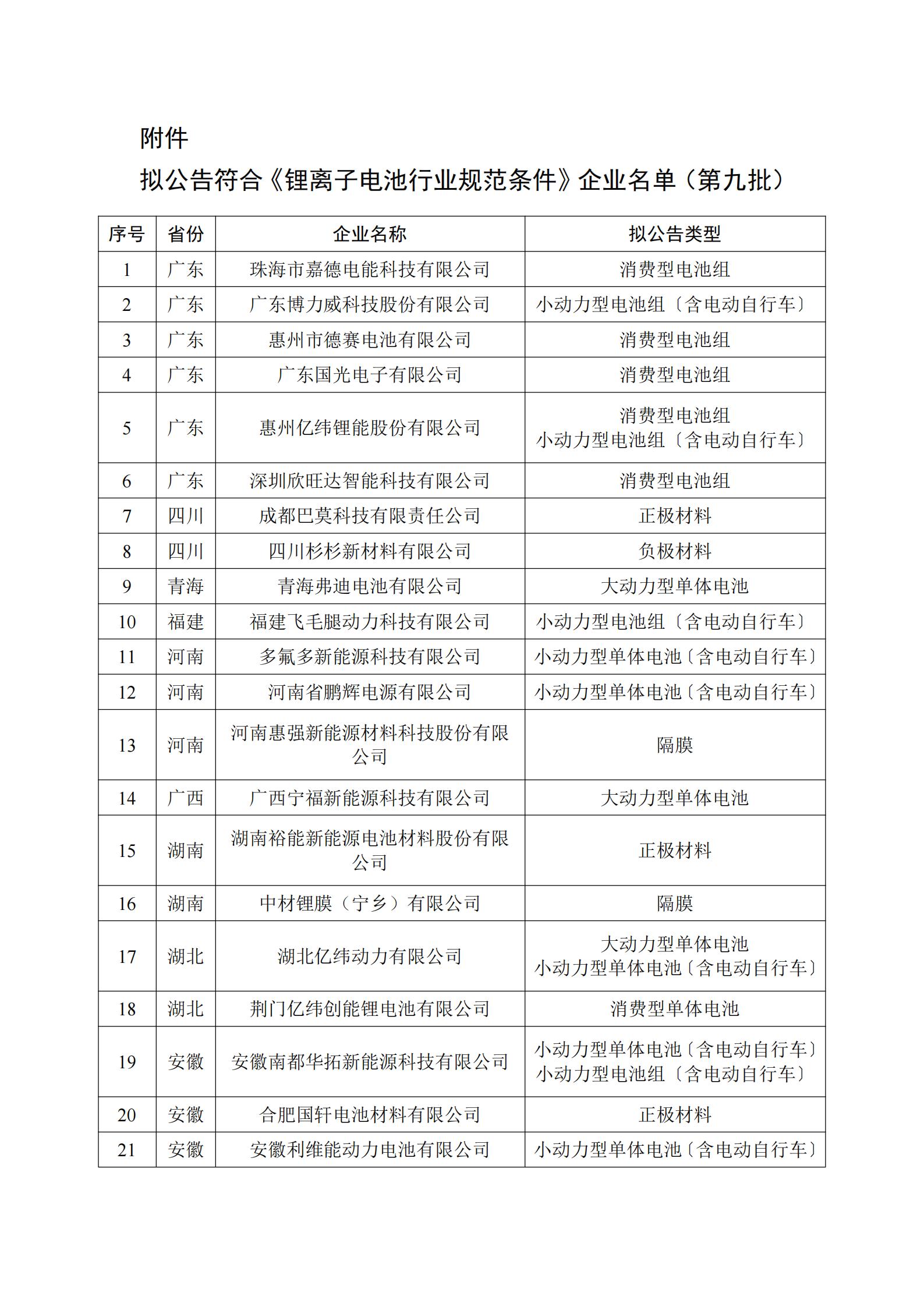 附件:拟公告符合《锂离子电池行业规范条件》企业名单(第九批)