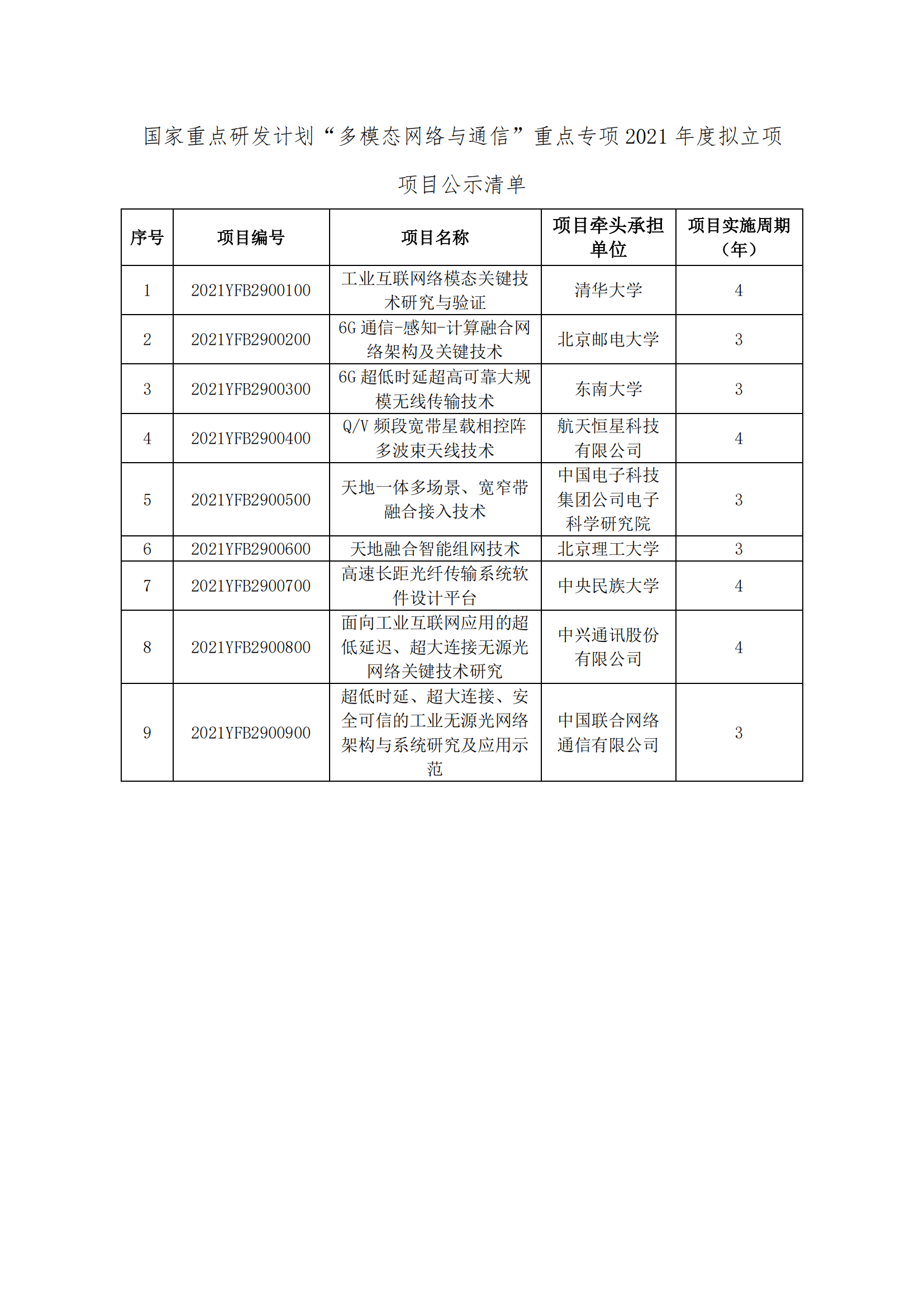 国家重点研发计划“多模态网络与通信”重点专项2021年度拟立项项目公示清单.pdf