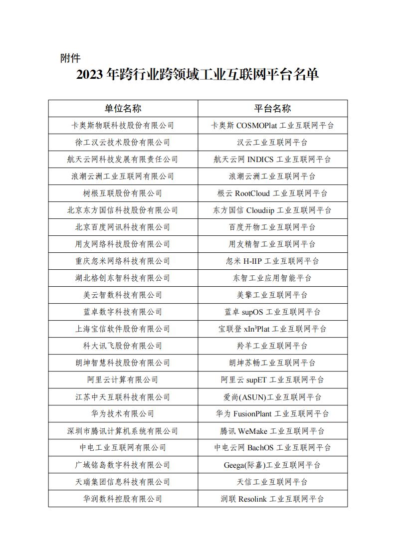 工业和信息化部办公厅关于公布2023年跨行业跨领域工业互联网平台名单的通知