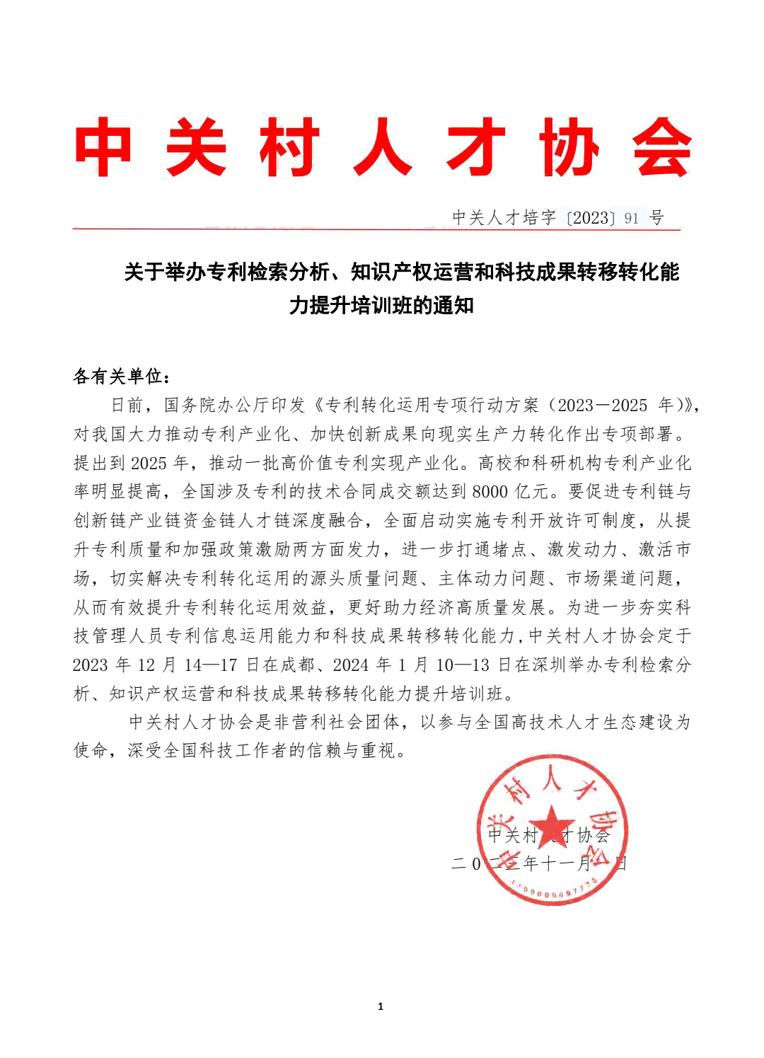 专利检索分析、知识产权运营和科技成果转移转化能力提升培训班(12月成都1月深圳)