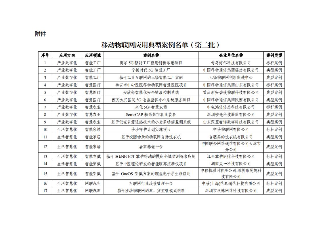 附件:移动物联网应用典型案例名单(第二批)