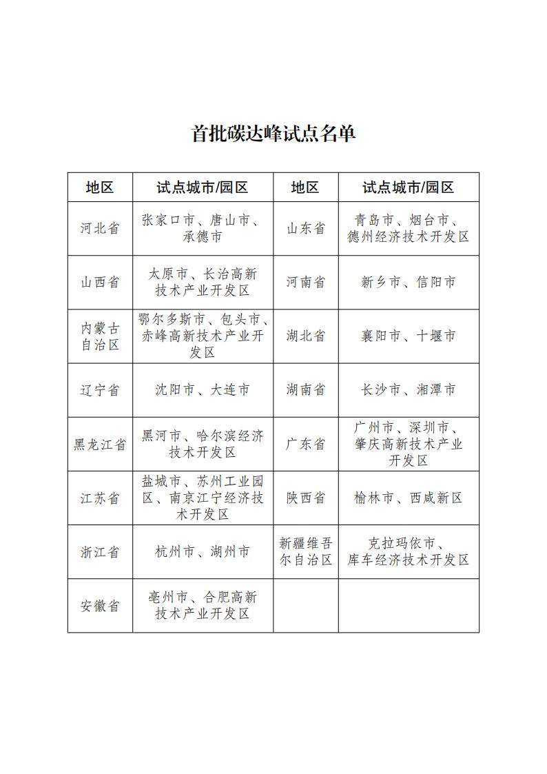 为落实国务院《2030年前碳达峰行动方案》(国发〔2021〕23号)有关部署,按照《国家碳达峰试点建设方案》(发改环资〔2023〕1409号)工作安排,经有关地区城市和园区自愿申报、省级发展改革委推荐、省级人民政府审核、国家发展改革委复核,确定张家口市等25个城市、长治高新技术产业开发区等10个园区为首批碳达峰试点城市和园区,现予公布,并就有关事项通知如下: