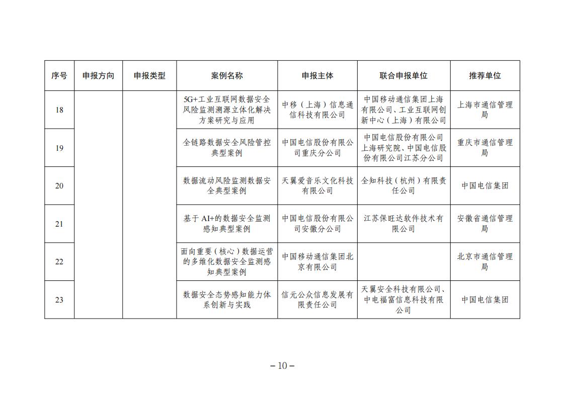 根据《工业和信息化部办公厅关于组织开展2023年工业和信息化领域数据安全典型案例遴选工作的通知》(工信厅网安函〔2023〕266号)部署安排,经申报推荐、形式审查、专业初审和专家评审,现将2023年工业和信息化领域数据安全典型案例名单予以公示。请社会各界监督,如有异议,请书面形式反馈。