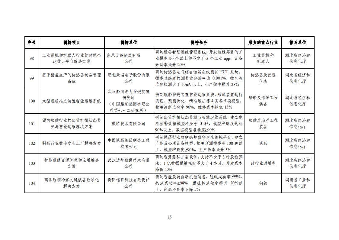 根据《关于开展2023年度智能制造系统解决方案揭榜挂帅项目申报工作的通知》(工信厅联通装函〔2023〕274 号),现将拟入选的2023年度智能制造系统解决方案揭榜挂帅项目名单进行公示,请社会各界监督。如有异议,请在公示期内将意见书面反馈至工业和信息化部装备工业一司(智能制造处)。