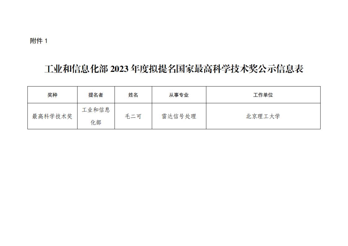 附件:1.工业和信息化部2023年度拟提名国家最高科学技术奖公示信息表