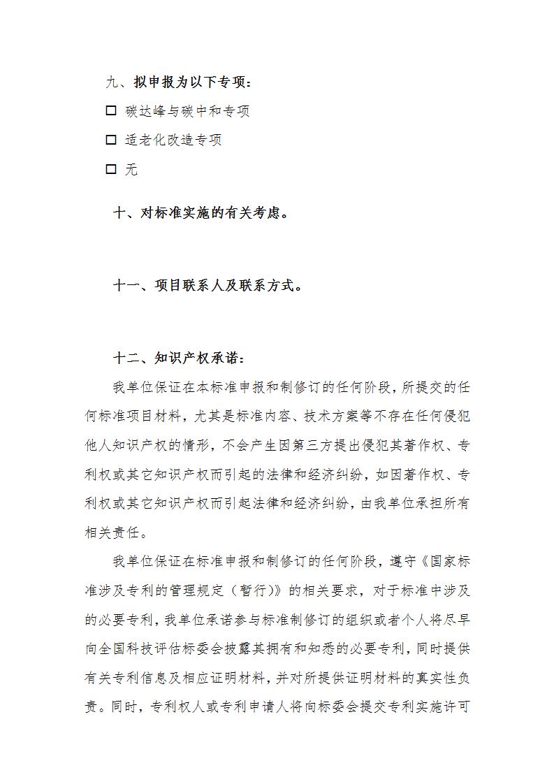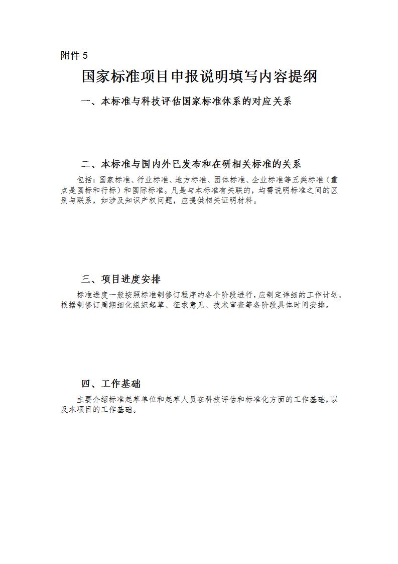 3.项目申报说明(内容提纲见附件5)。应加盖项目牵头单位公章,并明确标准与科技评估国家标准体系的对应关系、标准与国内外已发布和在研相关标准的关系、相关工作基础、是否同步制定国际标准或国家标准外文版、对标准实施的有关考虑、知识产权承诺等。
