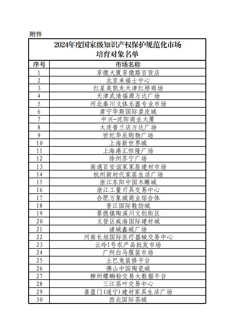 国家知识产权局|关于公布2024年度国家级知识产权保护规范化市场培育对象的通知