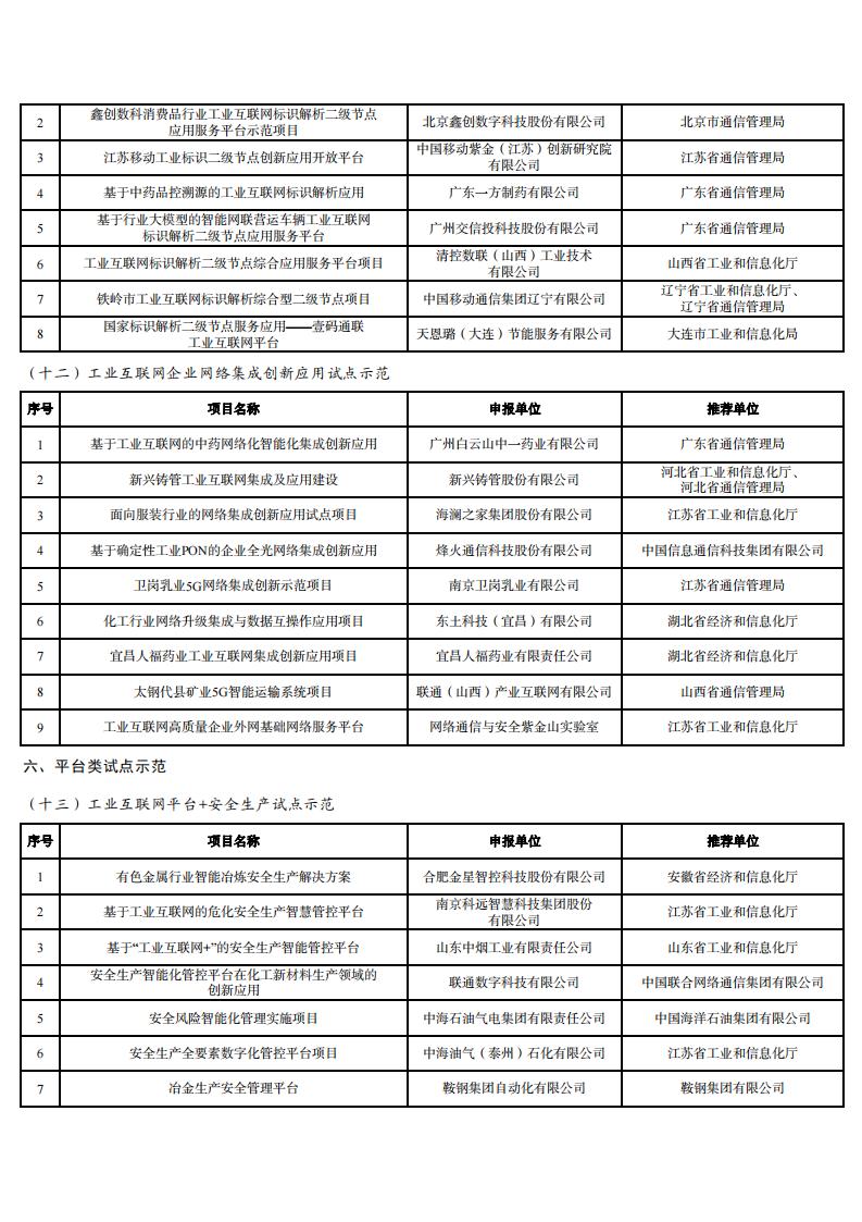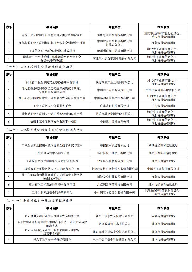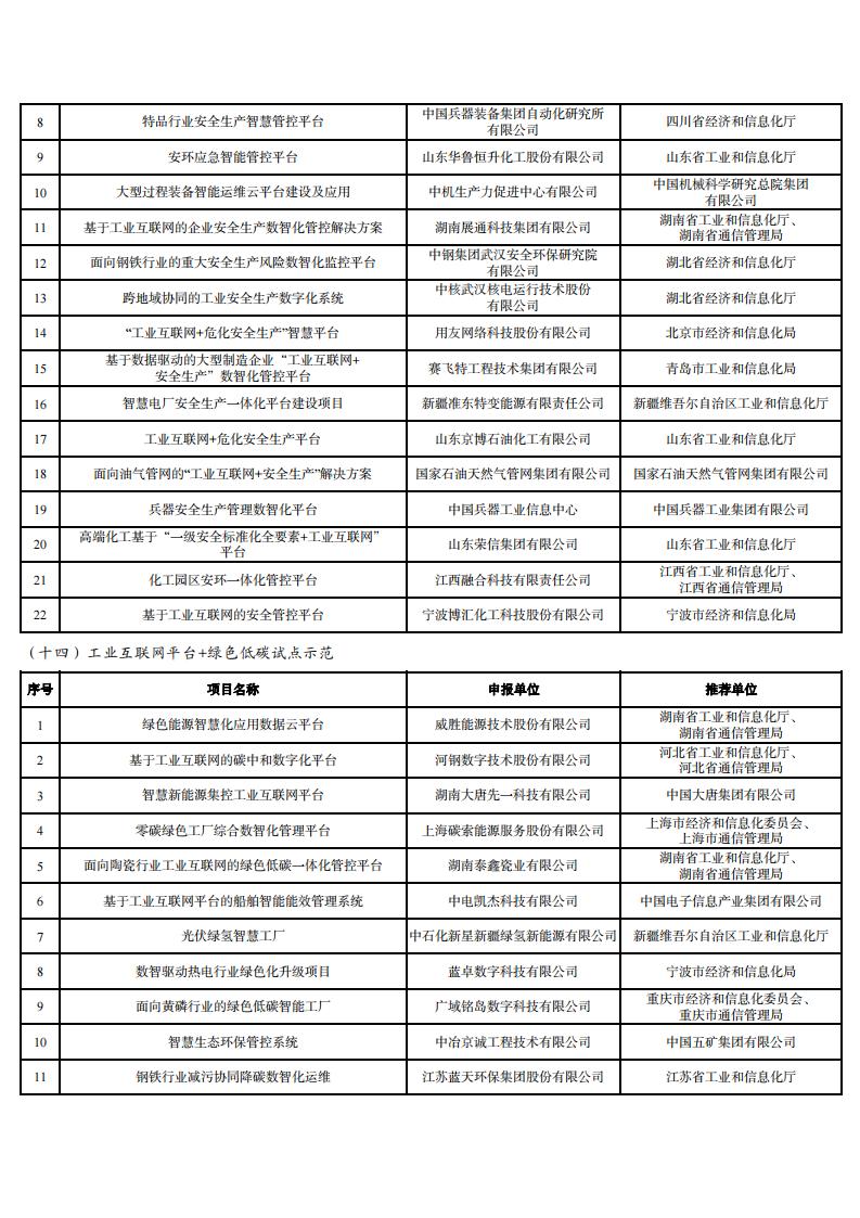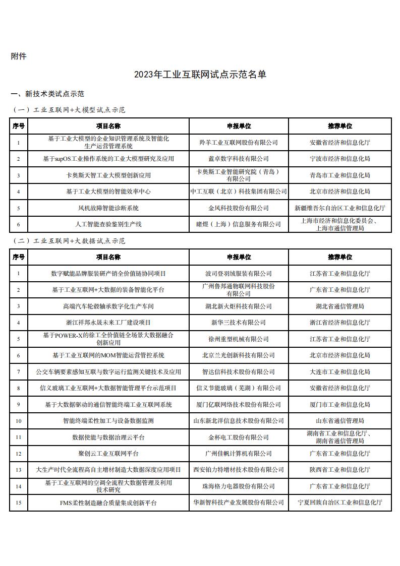 根据《工业和信息化部办公厅关于组织开展2023年工业互联网试点示范项目申报工作的通知》(工信厅信管函〔2023〕319号)要求,经企业自主申报、地方推荐、专家评审和网上公示,确定了 2023 年工业互联网试点示范项目名单,现予以公布。