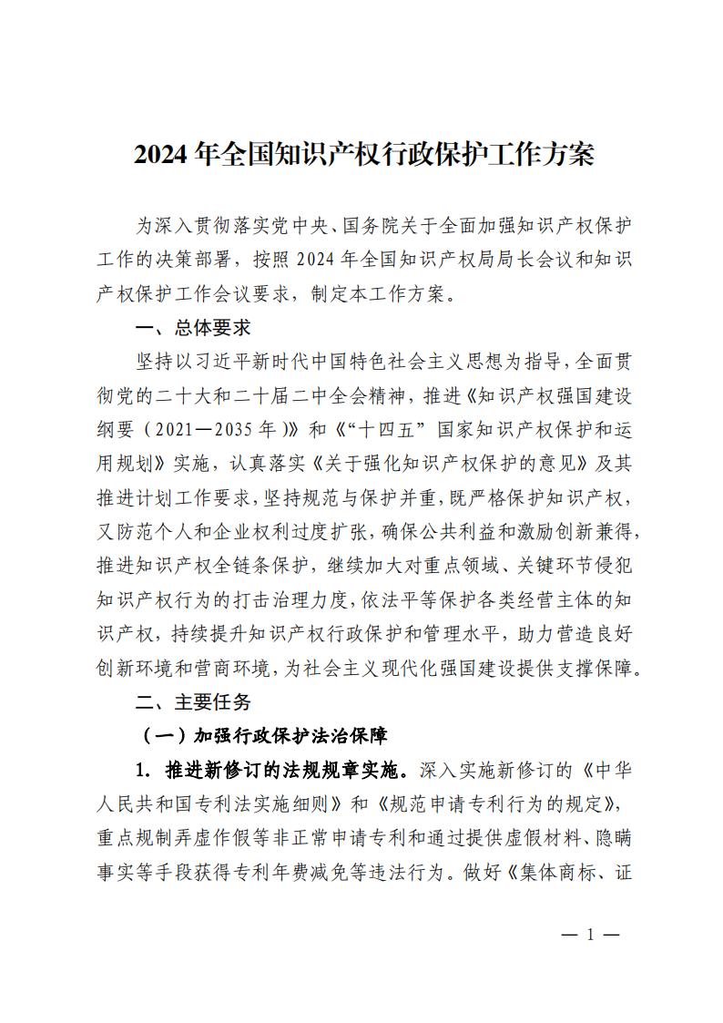 国家知识产权局关于印发2024年全国知识产权行政保护工作方案的通知