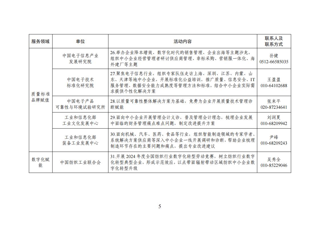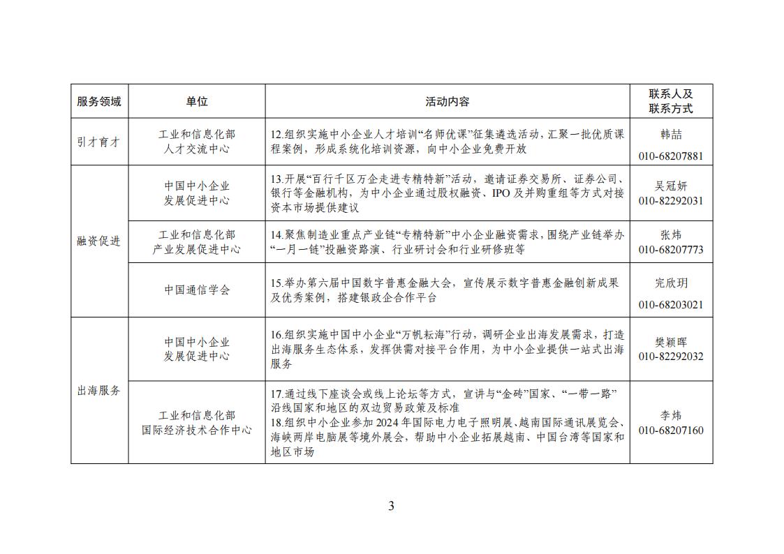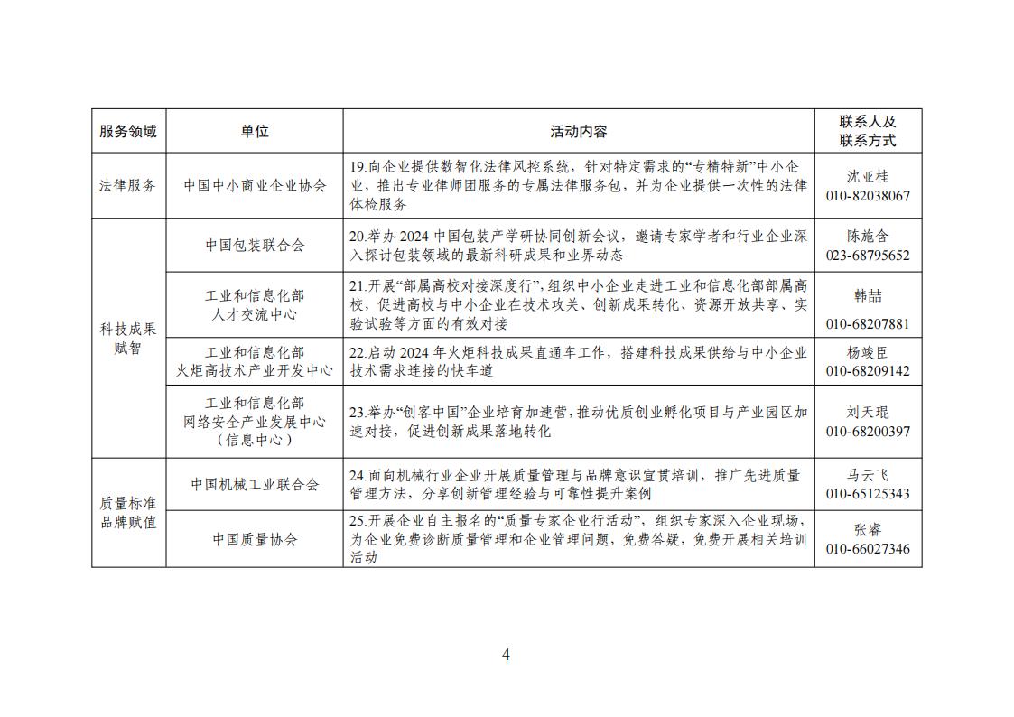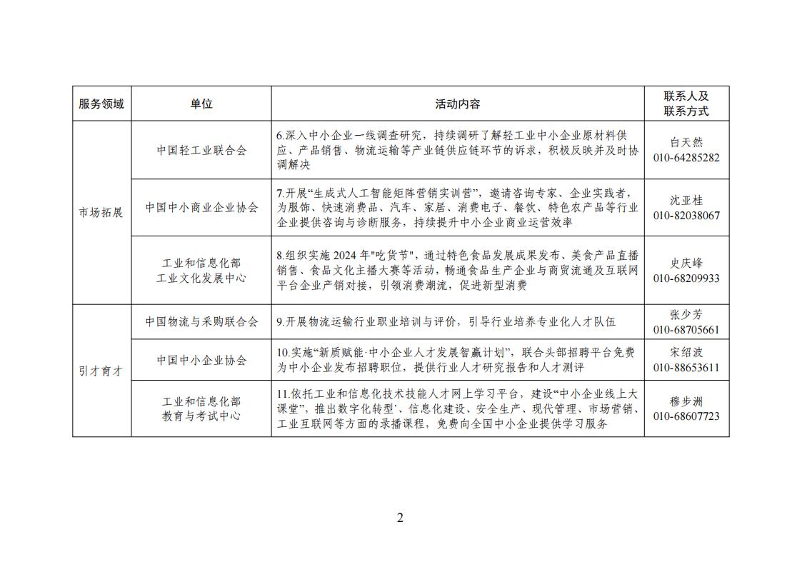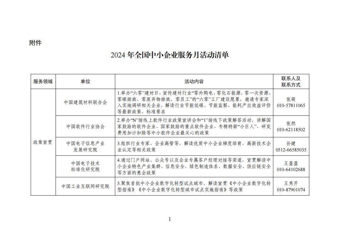 根据2024年“一起益企”中小微企业服务行动要求,有关行业协会、工业和信息化部所属单位按照《2024年全国中小企业服务月活动清单》(见附件),从政策宣贯、市场拓展、引才育才、融资促进、出海服务、法律服务、科技成果赋智、质量标准品牌赋值、数字化赋能等9个方面开展服务活动。