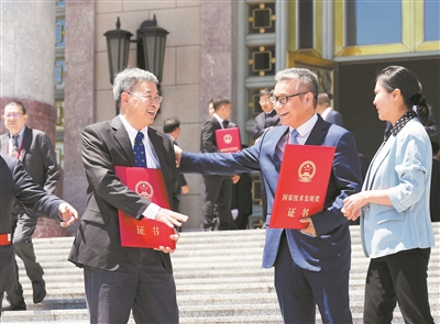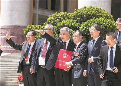 6月24日上午,全国科技大会、国家科学技术奖励大会、两院院士大会在京召开。图为获奖人员在人民大会堂前合影留念。