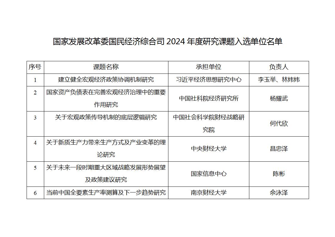 国家发展改革委国民经济综合司关于2024年度研究课题入选单位的公告